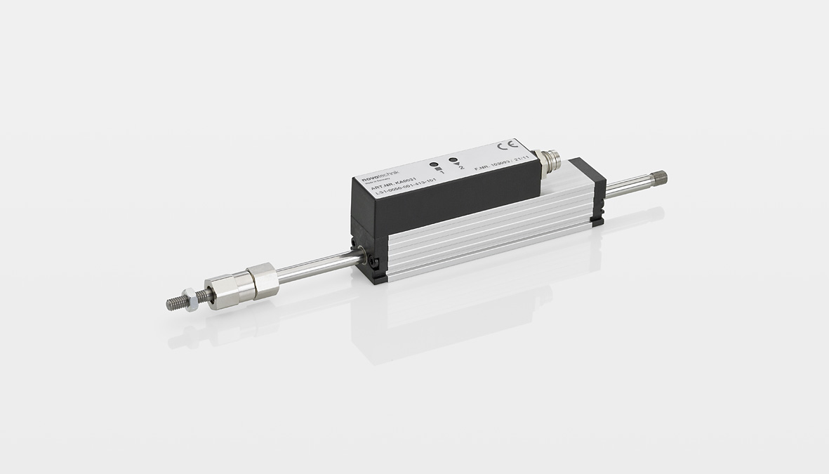 Absolute transducer in compact profile design with double-sided supported actuating rod; NOVOPAD non-contating, inductive measurement principle; Teach-in function with status LEDs; ball coupling for backlash- and shear force free operation , long life.