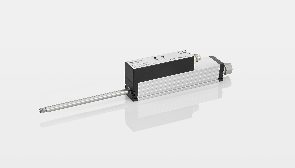 Absolute transducer in compact profile design with double-sided supported actuating rod and internal return spring; NOVOPAD non-contacting, inductive measuring principle, Teach-in function with status LEDs, probe tip with pressed-in hardened metal ball, long life.
