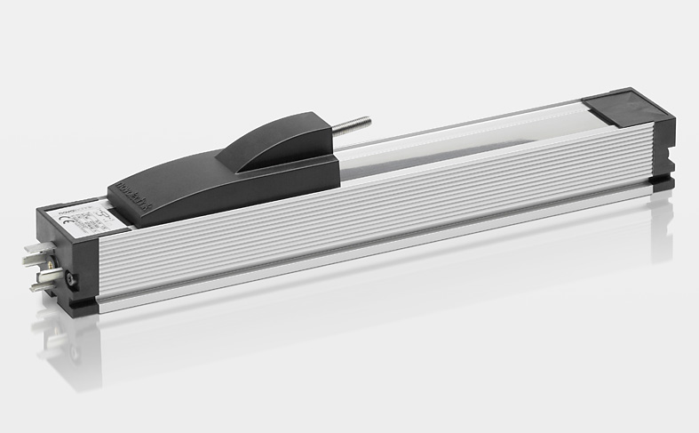 Potentiometric, absolut position transducer without actuating rod with lengthwise coupling for reduced overall dimensions; metal wiper carrier; shear force free linkage via ball coupling; long life.
